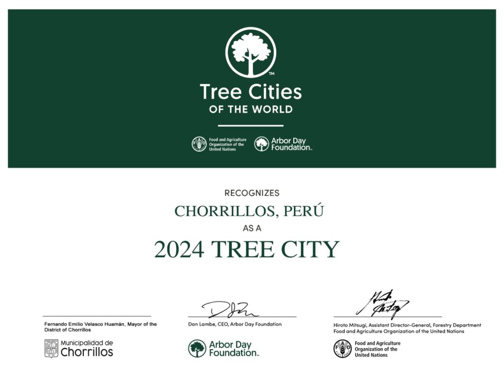 Chorrillos ha sido distinguida como Ciudad Arbórea del Mundo por la Fundación Arbor Day y la Organización de las Naciones Unidas para la Alimentación y la Agricultura (FAO), sumándose a una red global de ciudades comprometidas con la gestión sostenible de sus árboles urbanos.