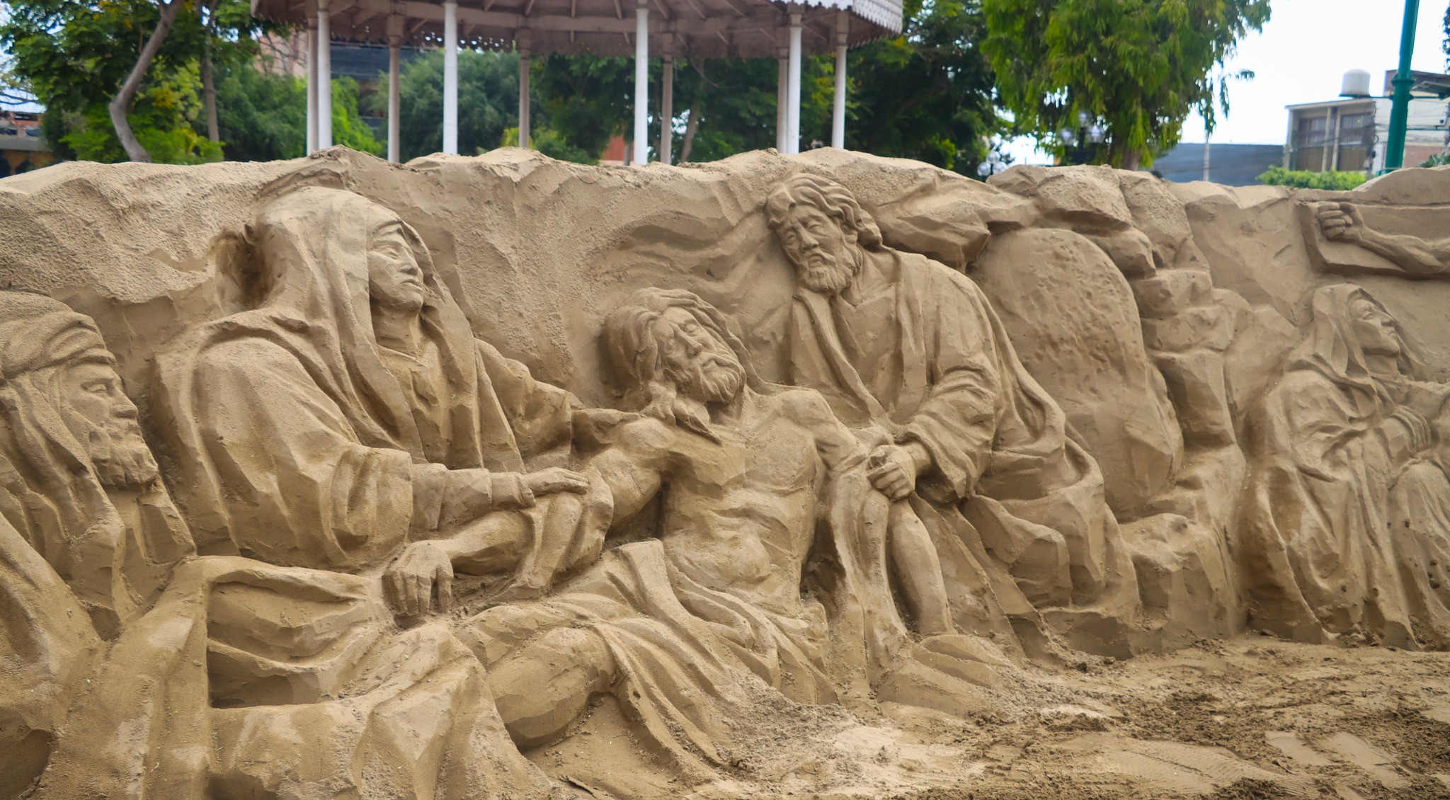 La tradicional Semana Santa que se celebra en Pachacámac tiene este año un atractivo muy especial, porque se exhibió en la Plaza de Armas del distrito, una escultura de arena de más de 15 metros de largo representando el Vía Crucis, la misma que tuvo la colaboración de niños, quienes participan en el Taller de Modelado de la Municipalidad.
