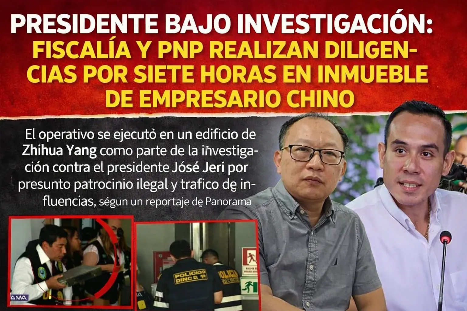 La Fiscalía y la Policía Nacional del Perú ejecutaron una diligencia de exhibición y revisión documental que se extendió por más de siete horas en un edificio del empresario chino Zhihua Yang, en Lima, como parte de la investigación seguida contra el presidente José Jerí por los presuntos delitos de patrocinio ilegal y tráfico de influencias. El procedimiento se realizó el viernes 30 de enero en el denominado Centro Empresarial San Luis y fue revelado por un reportaje del programa Panorama.