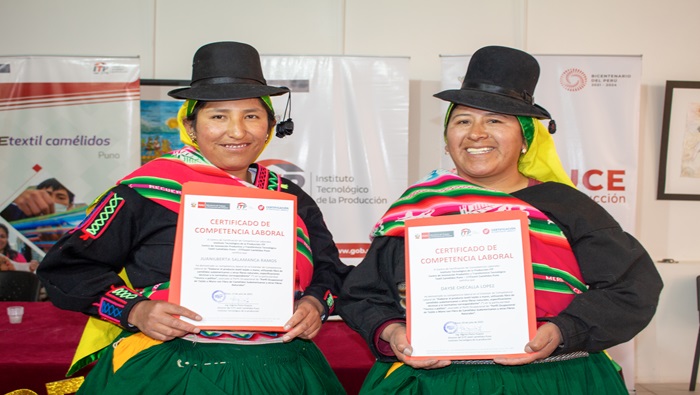 A través de una ceremonia especial organizada por el CITEtextil Camélidos Puno, del Instituto Tecnológico de la Producción (ITP), adscrito al Ministerio de la Producción (PRODUCE), en articulación con la Subgerencia de Promoción Empresarial y Desarrollo Económico de la Municipalidad Provincial de Puno, se hizo la entrega de 23 certificados de competencias laborales a artesanas y artesanos textiles de la región.