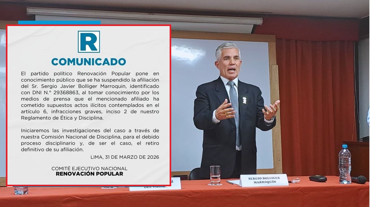 El partido señaló que se ha “suspendido la afiliación del Sr. Sergio Javier Bolliger Marroquin, al tomar conocimiento por los medios de prensa que el mencionado afiliado ha cometido supuestos actos ilícitos contemplados en el artículo 6, infracciones graves, inciso 2 de nuestro Reglamento de Ética y Disciplina”.