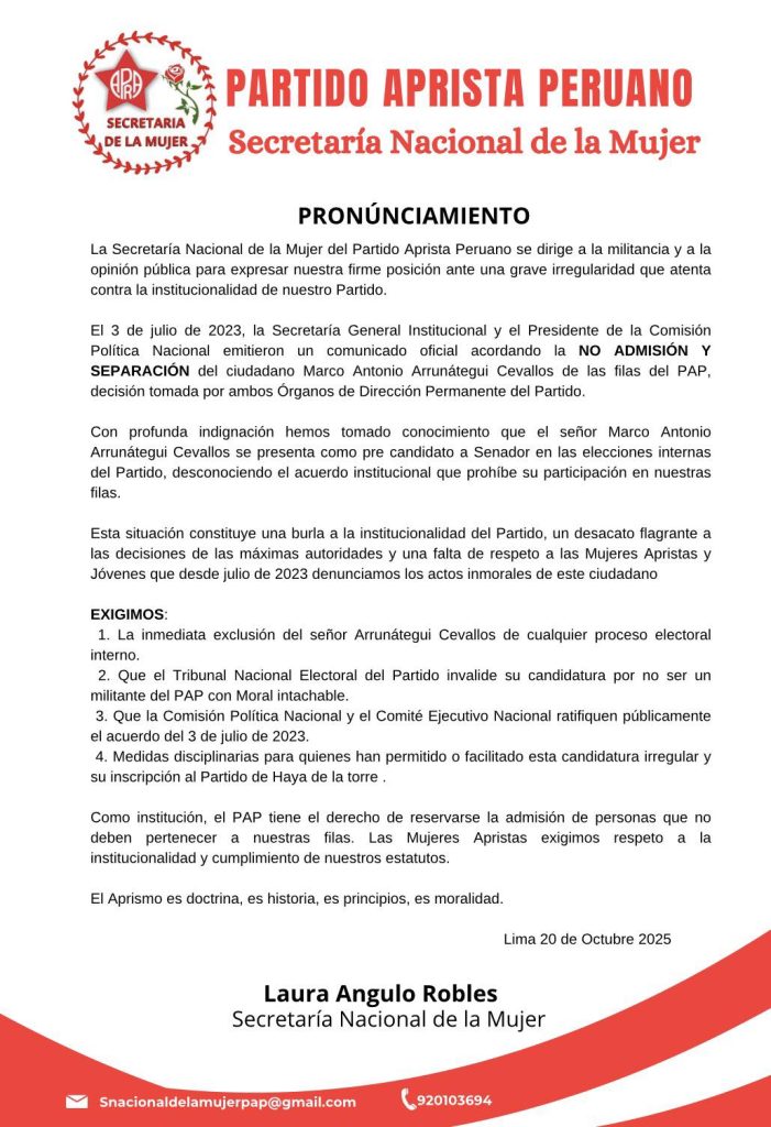 La Secretaría Nacional de la Mujer del Partido Aprista Peruano (PAP), liderada por Laura Angulo Robles, ha emitido un enérgico pronunciamiento denunciando una «grave irregularidad» y una «burla a la institucionalidad» del partido. La organización exige la «inmediata exclusión» de Marco Antonio Arrunátegui Cevallos del proceso electoral interno, donde actualmente figura como precandidato al Senado.