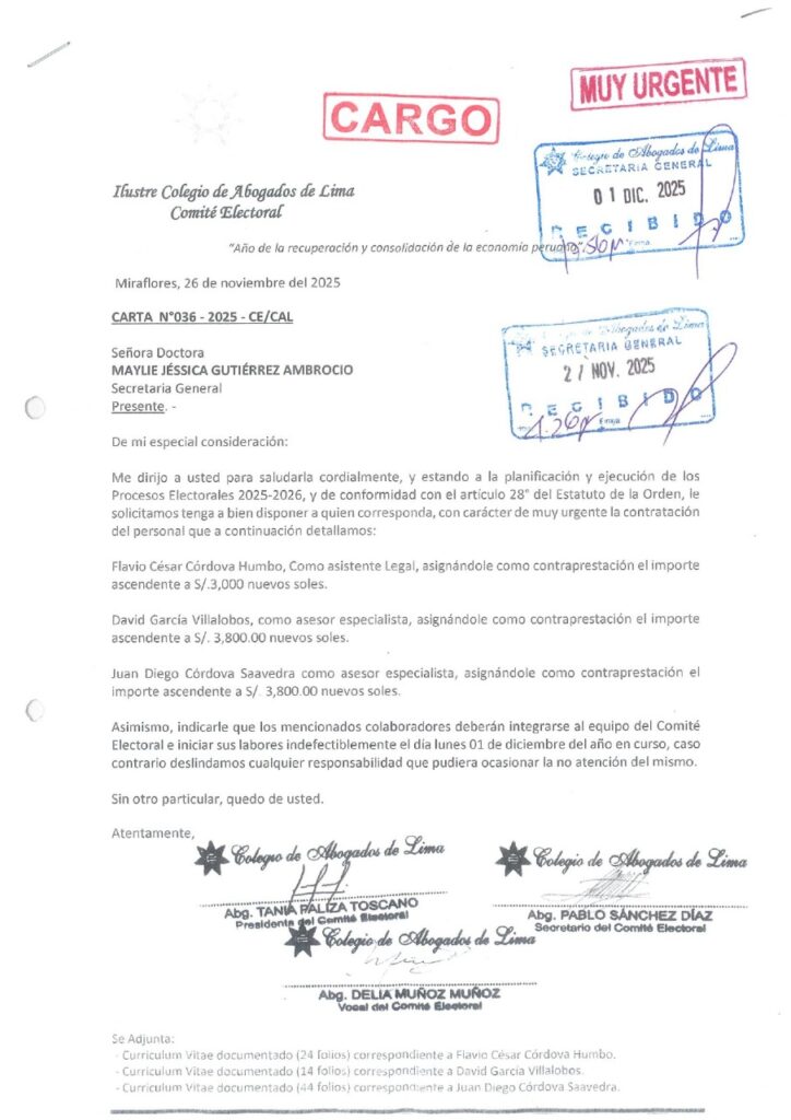 En un tono firme, el Colegio de Abogados de Lima solicitó a la Dra. Paliza que remita el detalle de los gastos proyectados para el proceso electoral, con el fin de asegurar la transparencia y la razonabilidad presupuestal.